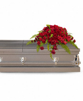The casket is comprised of a variety of flowers, including red roses, spray roses, gerberas, gladioli, and carnations. Gerberas are known for their purity and cheerfulness, which can bring a small amount of brightness to a difficult time. Gladiolus, on the other hand, represent honor, remembrance, and strength, reminding the family that the memory of their loved one will always be cherished.