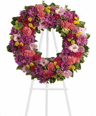 If you were unaware of this fact and have a funeral to attend soon, you may want to consider purchasing the Ringed by Love wreath. While many wreaths may seem somber, this one is different. It is a stunning arrangement of dreamy blooms, including green hydrangea, hot pink spray roses, pink gladioli, daisy spray, chrysanthemums, and carnations. The combination of bright and soft hues will convey sympathy while also sending the message that better days are ahead.