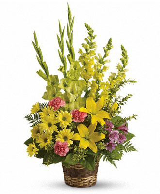 This beautiful floral arrangement is a symbol of devotion, affection, and loss. It features yellow Asiatic Lilies, which represent restored innocence after death, and Snapdragons, which symbolize inner strength during trying times. The addition of green Gladioli, associated with gladiators and great strength, adds to its significance.